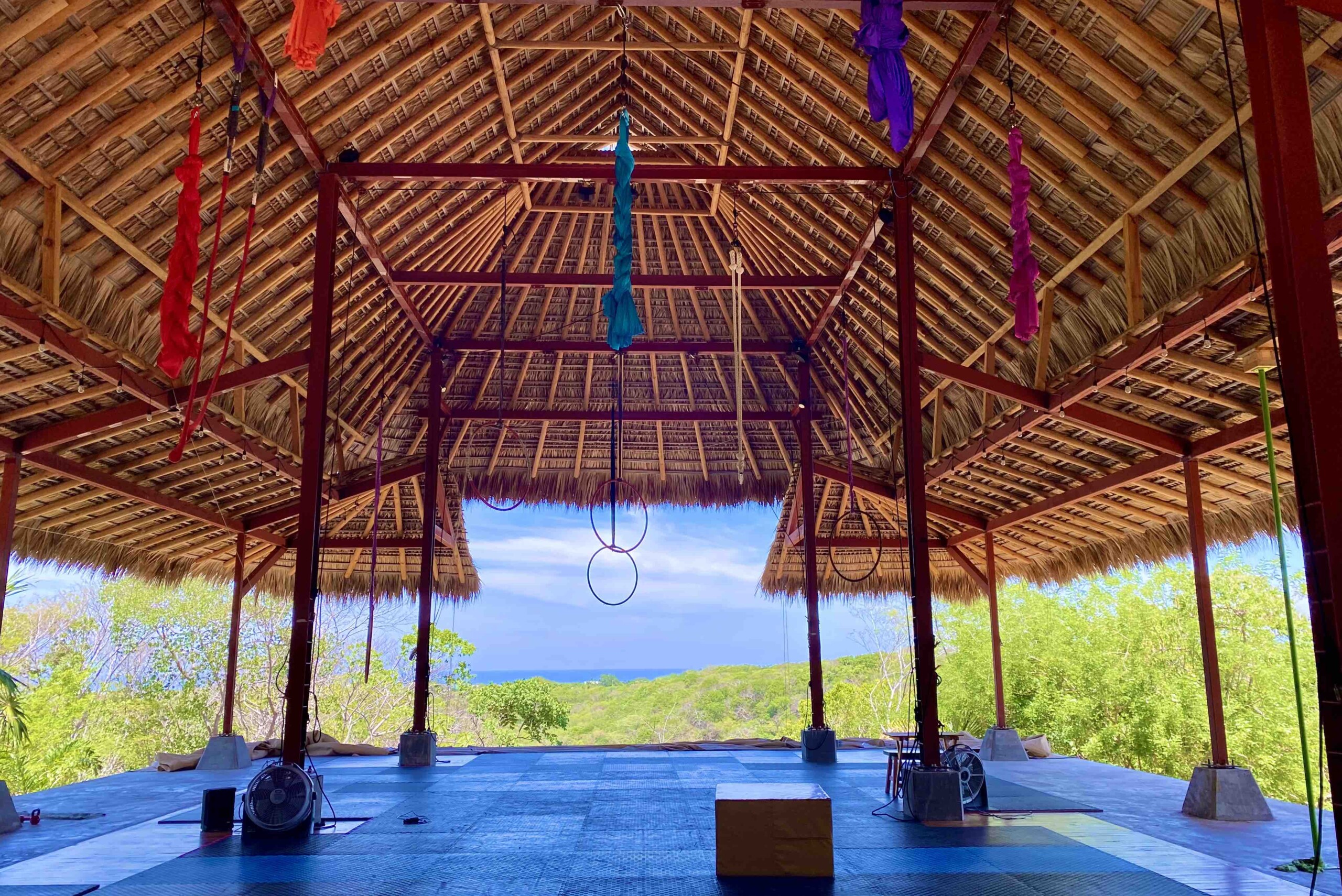 Our gym is a 2000 square foot (185 square meters) open air training space with wood floors and 12 aerial rig points at 22 feet (6.4 meters) high. Fully equipped with everything you need for various physical training practices.
