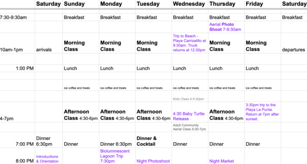 Most of our retreats are 6 days and 7 nights long, with 5 total days of classes. Each day has a morning and afternoon class session. We use the following model which works very well: